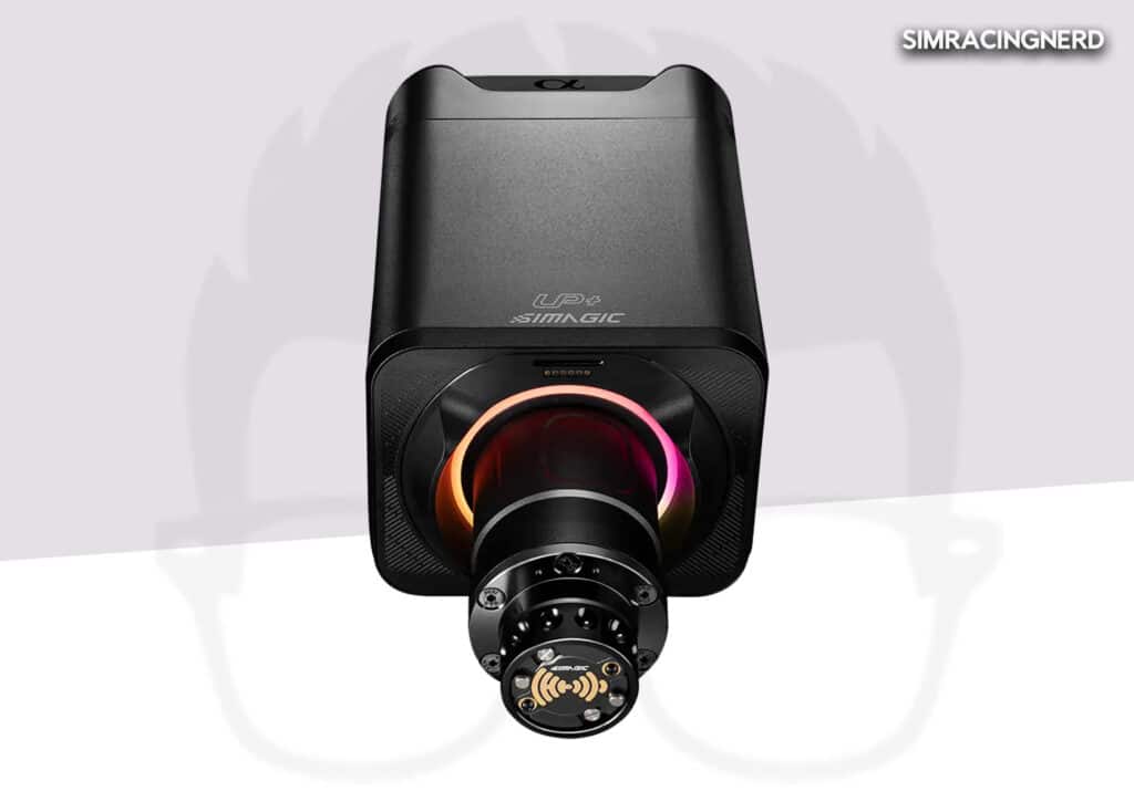 Sur le haut du caisson, on voit le logo de Simagic juste derrière l’arbre de transmission, et le logo Alpha à l’arrière.