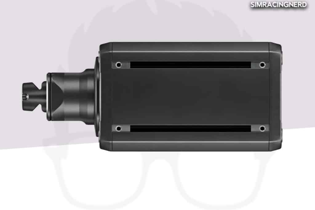 Sur la face avant de la Simucube 3 Sport prend place un tout nouveau Quick Release, qui est le même sur toutes les autres variantes des bases DD. Ce QR ressemble à celui utilisé par Fanatec, avec une forme triangulaire et des coins arrondis. Sur les côtés du QR, c’est tout comme chez Fanatec, avec des encoches pour accueillir le mécanisme de sécurité du dispositif. Je trouve que c’est beaucoup mieux en termes de design que l’ancien QR de Simucube, car désormais, l’opération pour swapper de volants est plus rapide.